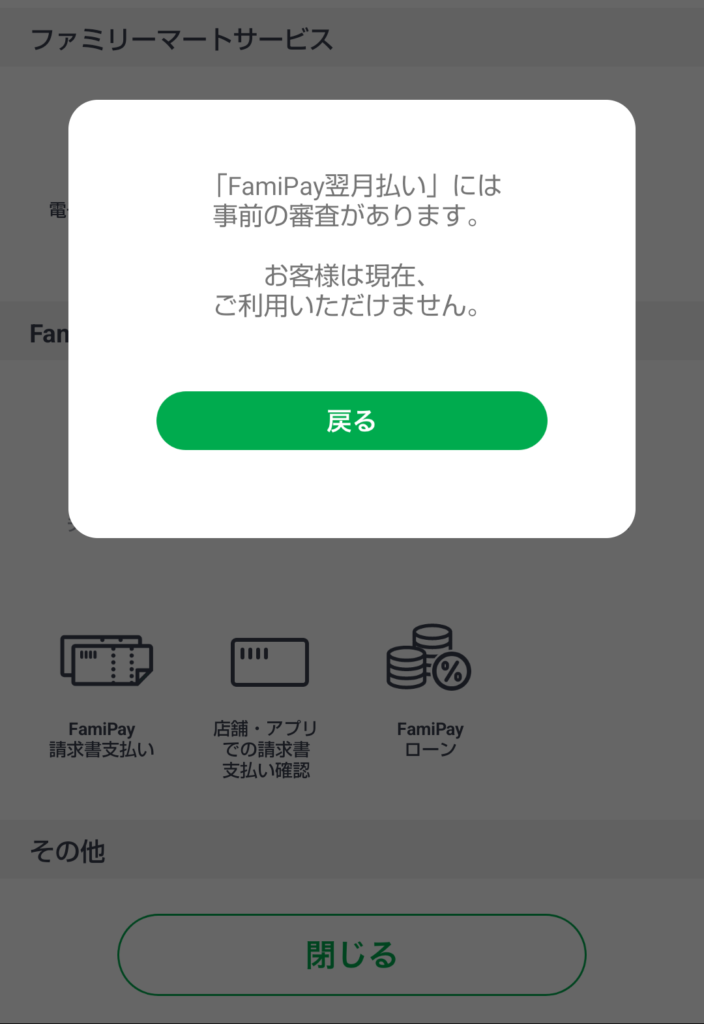 ファミペイ利用者に対するサービスと考えると当然なのだが、ファミペイアプリに登録した直後の状態(電話番号/郵便番号/性別のみを登録)では、そもそも「FamiPay翌月払い」のボタンがグレーアウトされており押すと以下のメッセージが表示される。登録案内のWebページでは、銀行口座登録→本人確認→申込情報入力の3ステップで翌月払いの申し込みができると案内されているが、アプリ登録直後ではそもそも申し込みができない。翌月払いの申し込み前にもかかわらずメッセージの内容が審査に落ちた状態のように見えるので混乱を招く表現だと思う。(私はここで調査を終了した)