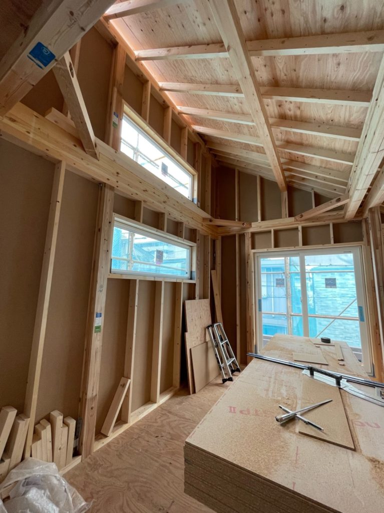 この近辺の日付の状況です。窓が入ったので光の差し込み加減がイメージできていい感じですが、両隣がまだ棟上していないので、立ち上がるとここからどれだけ暗くなるかが心配です。(特に1階)
