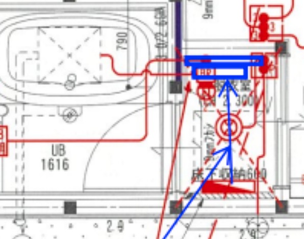 設計時点で、上海ロックダウンなど製造の影響により通常よりサイズの大きな品番となり、オープンハウス標準位置であるユニットバス扉上の設置は難しいということでしたので、外壁側の面への設置をお願いしました。そのタイミングの設計士さんの当初提案は反対の室内側への設置でした。