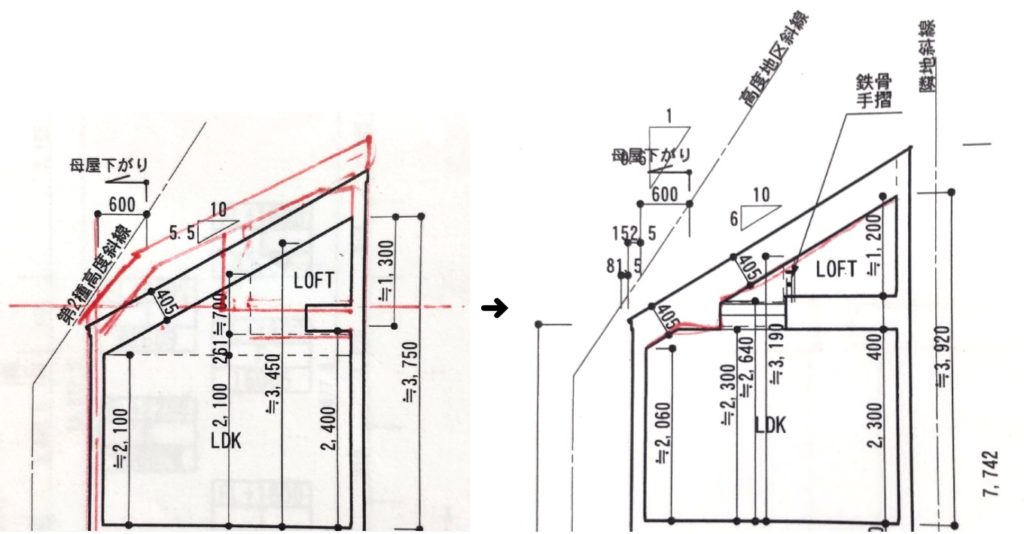 天井高については2階が2,300mmで希望通りでしたがロフトが最大1,200mm、最小460mmで前回の図面より低くなっていました。前回より2階で+200mm、ロフトが-100mmで計+100mmしかアップできなかったということになります。ロフトの最小天井高も随分低くなっていて残念でしたが、出来ないということであれば仕方ないので了承しました。ダウンライトをやめれば8cm位上げられるという話だったのでそれをやって少しでも天井高を確保しようと思います。