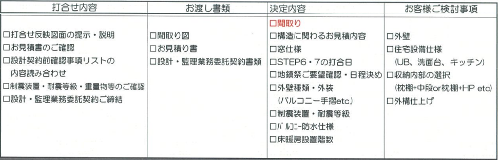 間取り・構造に関する24項目のチェック事項と、建築設計後の間取り変更不可であることや窓の目隠しとかエアコン給湯機などの吹き出し口に関して隣家と調整が必要となった場合は建築主が解決すること等の確認事項5項目からなる書面を読み合わせ、署名しました。
