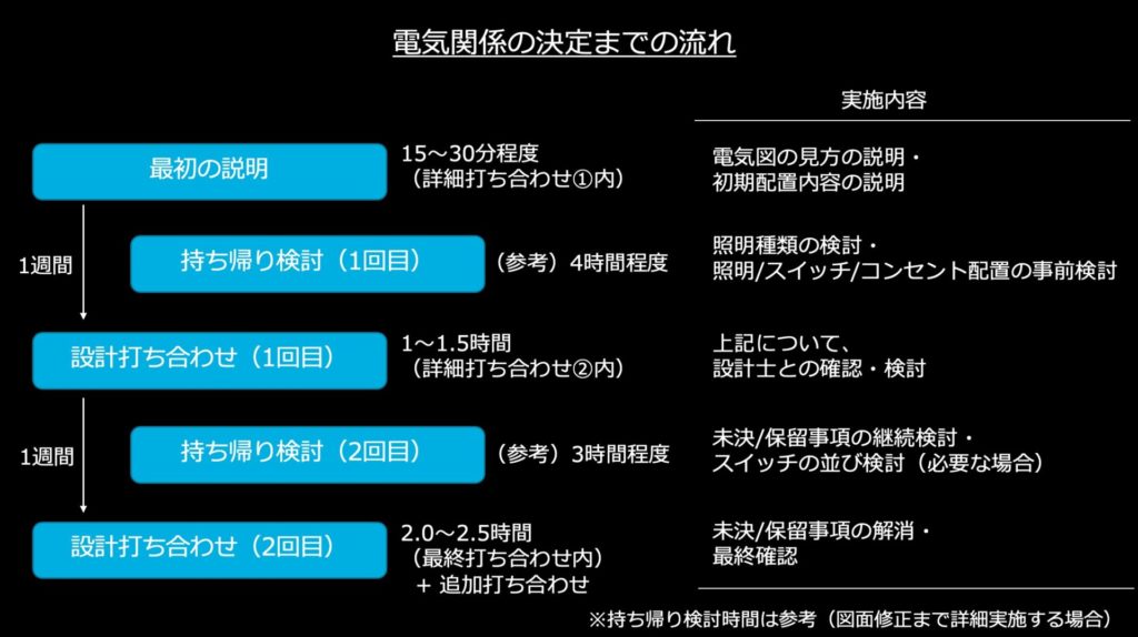 電気関係の見積もり確認は設計打ち合わせの最終回に、確定は設計打ち合わせ後(すべての仕様の確定後であり変更不可となったタイミング)になります。