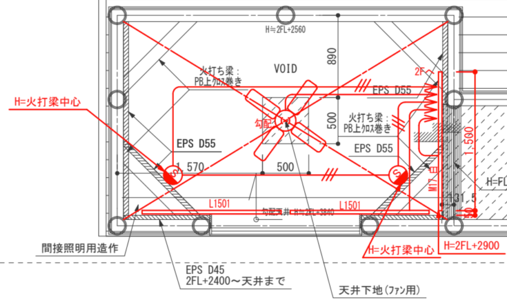我が家は、建築化照明としたので、それとファンの高さの位置関係を確認しました。建築化照明は火打ち梁の上に設置で、ファンが2階の軒高とする予定でファンの方が同じかやや下に来るため、建築化照明の光が直接当たらないと想定しています。