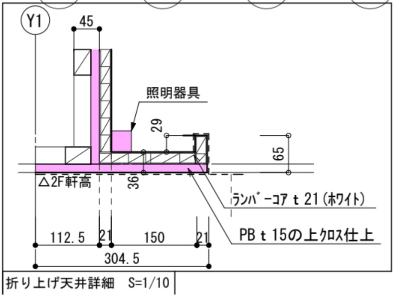 - 唯一の懸念点は、照明のすぐ上部の壁に高窓があるので見え方が綺麗ではないだろうということと、照明を設置する造作部分が20cmほど壁から出るため、リビングからみた時に高窓の下縁に被るかもしれないという点です。