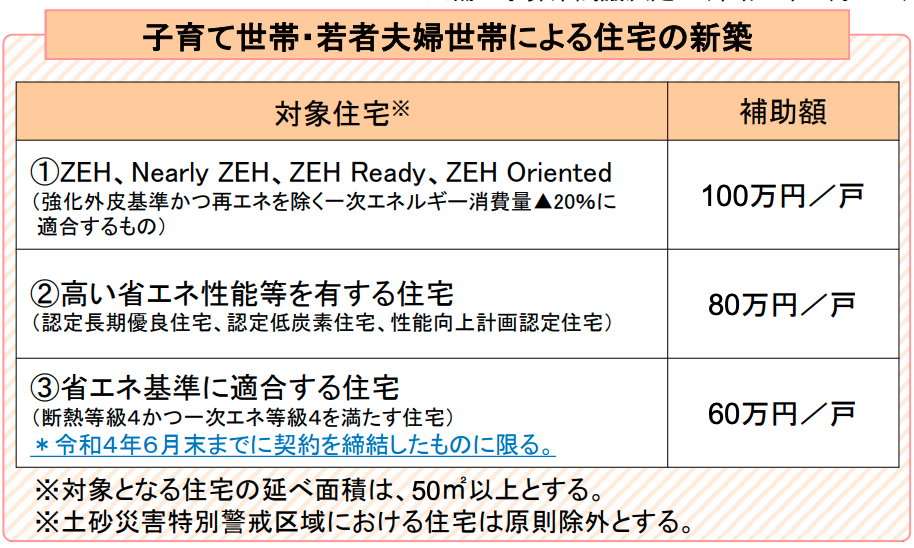 厚生労働省の「こどもみらい住宅支援事業」について2022/4/28に予算措置が拡大され、省エネ基準に適合する住宅については2022/6/30までに請負契約を締結(注文住宅の場合)すれば、60万円の給付を受けられるとの案内があり、請負契約時に申込書に記入するとのことでした。(オープンハウスの住宅は省エネ基準に適合するため6月中の請負契約案件については等しく案内している)